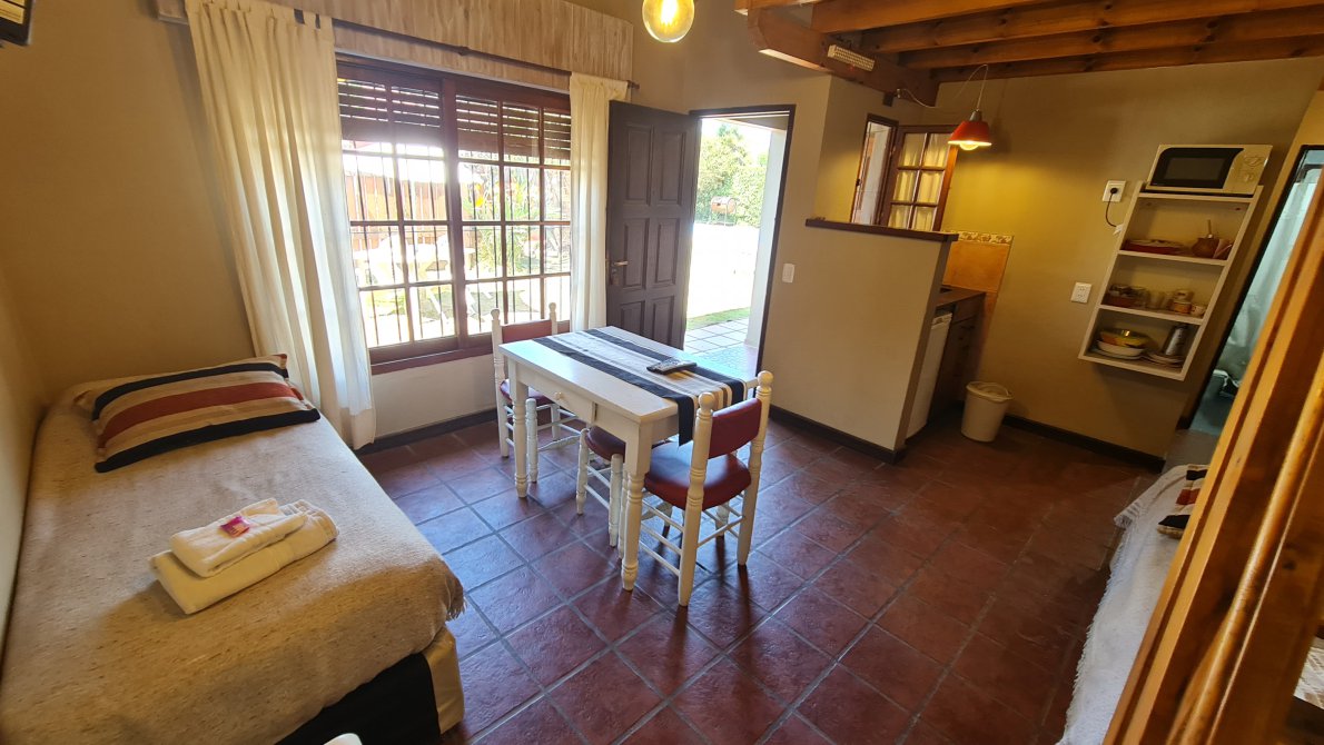 Cabaña 2 : Para 5 Personas, Living comedor con 3 Camas, cocina totalmente equipada con desayunador, amplio baño con antebaño, entrepiso altillo con cama matrimonial.