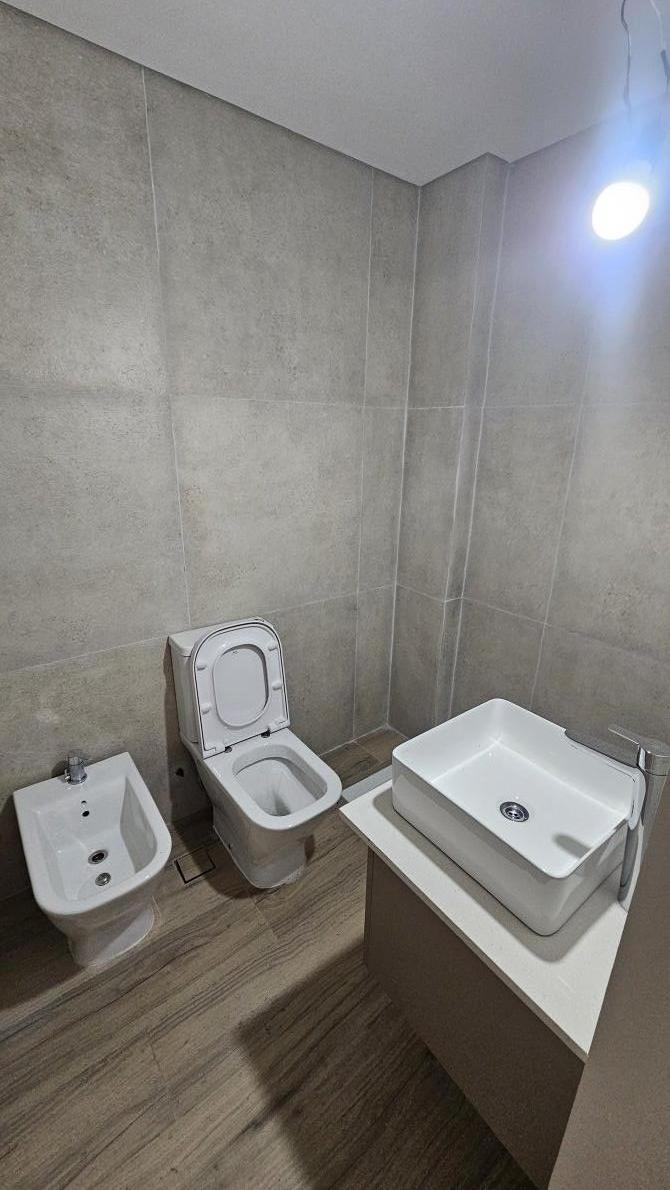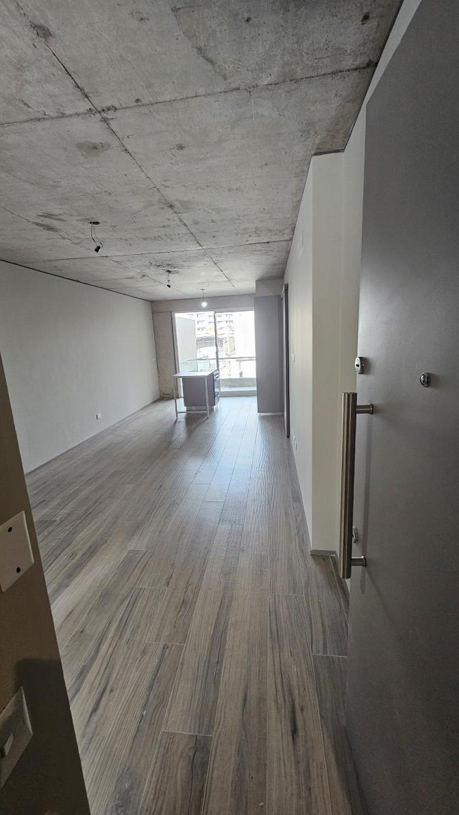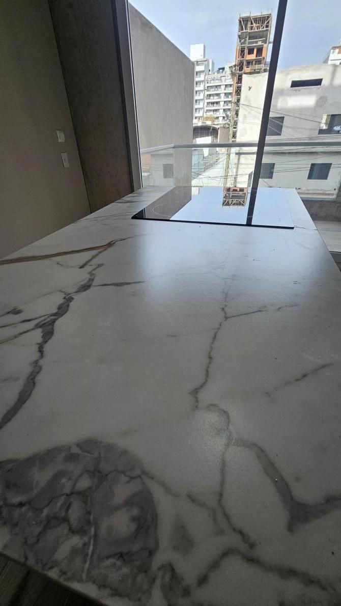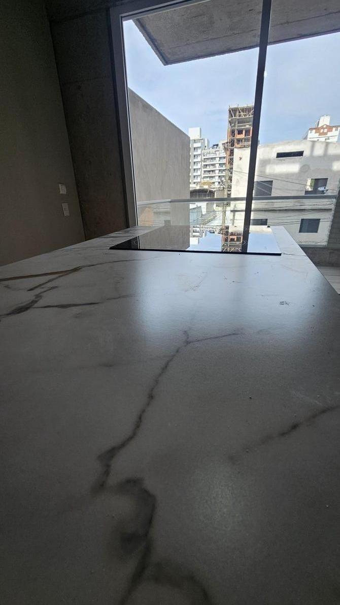 Cocina con bajo y sobre mesada integrada al living con isla con bajo mesada con cajoneras.
