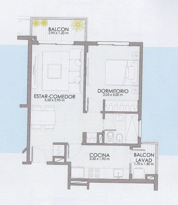 Estar comedor 5.50m x 2.95m con pisos porcelanato y balcon de 2.95 x 1.20, Cocina de 3.30m x 1.90 mts con amoblamiento de bajo mesada y alacena, mesada granito y cocina 4 hornallas encendido electronico, Lavadero 1.70m x 1.30m, Baño completo con artefactos sanitarios Roca , Habitacion de 3,05 x 3.00 mts con pisos flotantes y frente de placard.