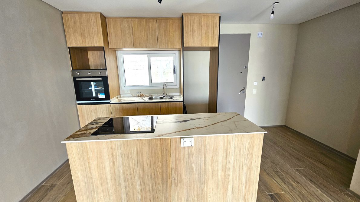 Cocina con bajo y sobre mesada integrada al living con isla con bajo mesada con cajoneras.