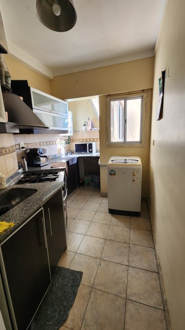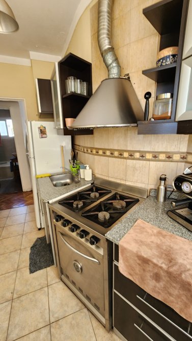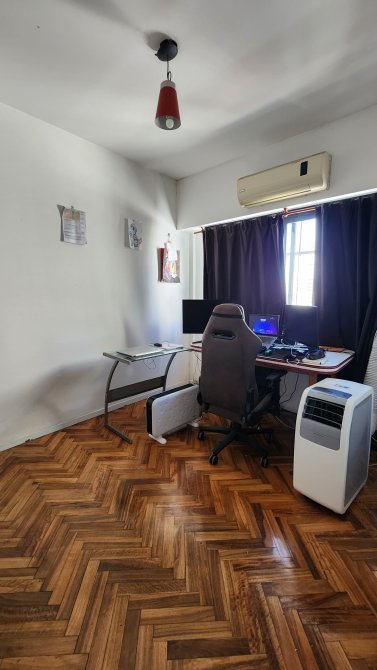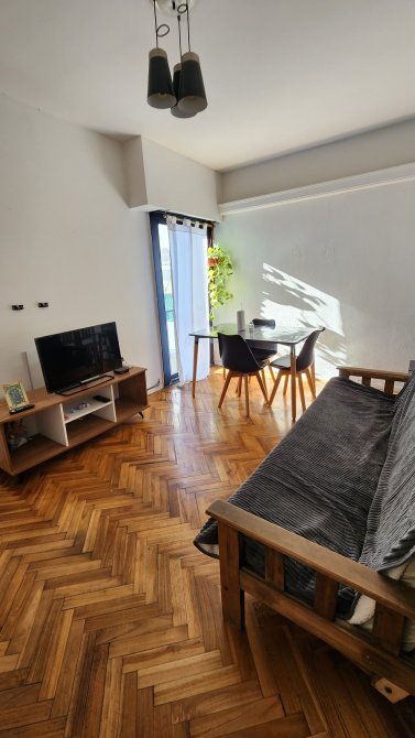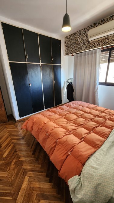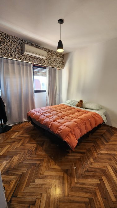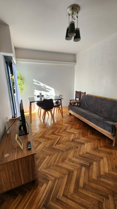 Living comedor de 5 x 3.2 mts con pisos parquet, cocina con bajomesada y alacena con cocina industrial de 4 hornallas, baño completo, dos dormitorios con placard y pisos en madera.