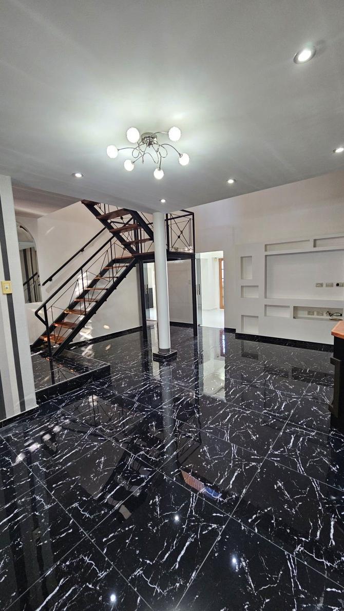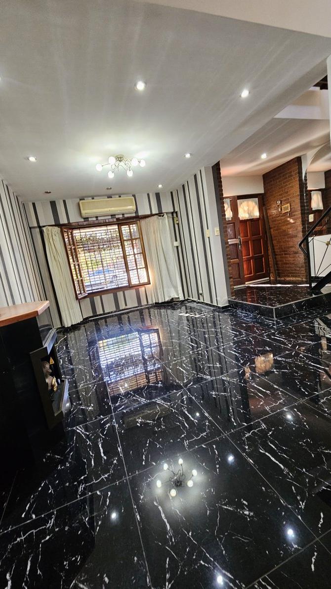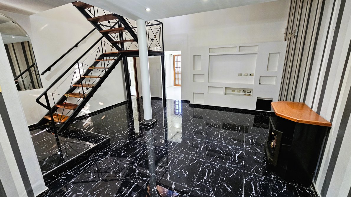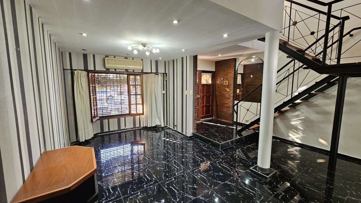 Jardin al frente, Entrada para auto, Amplio Living 6.30m x 3m, Decoracion super moderna con pisos de porcelanato negro, techos en madera y escalera abierta en hierro y medera.