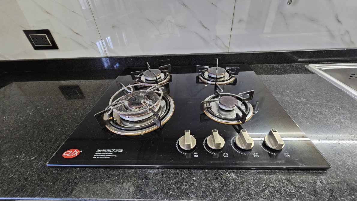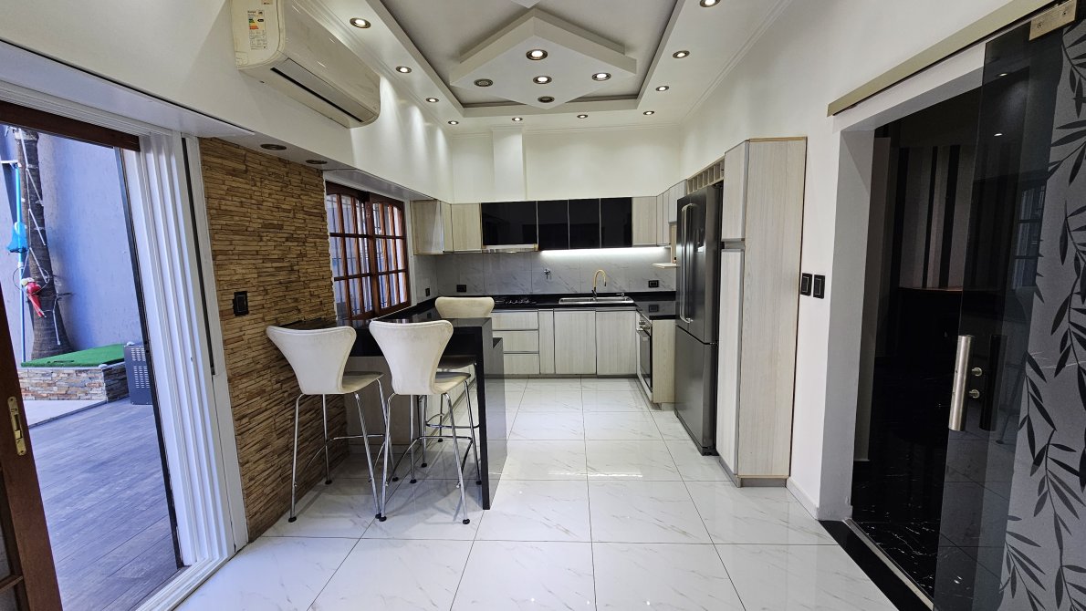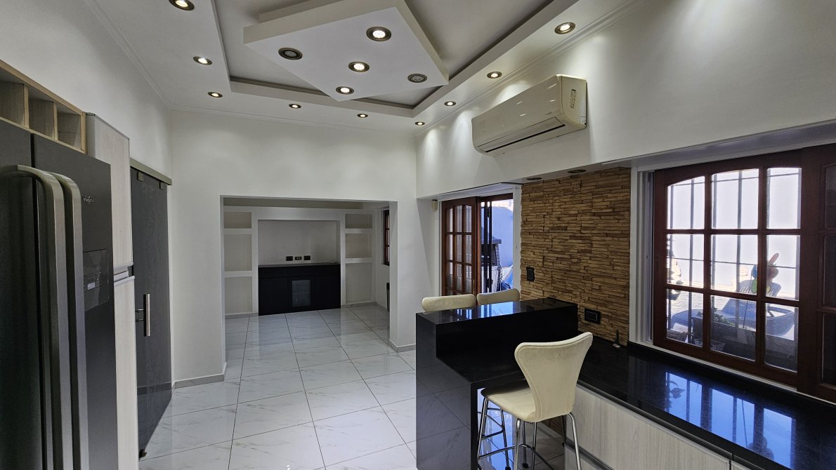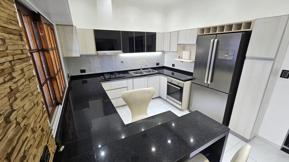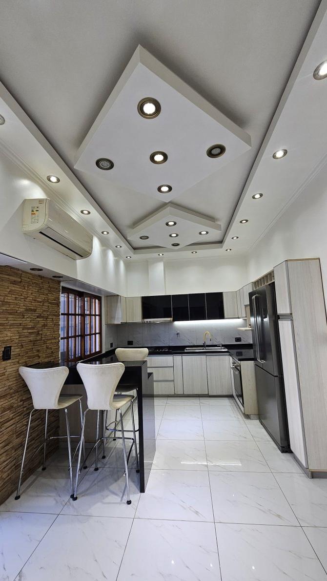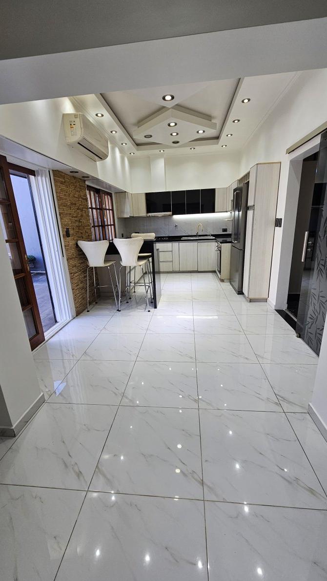 Cocina comedor de 8.45m x 3m Muebles y mesadas de primera calidad, cocina industrial, pisos de porcelanato blanco.