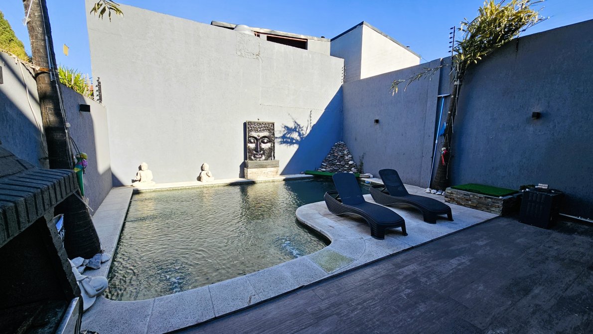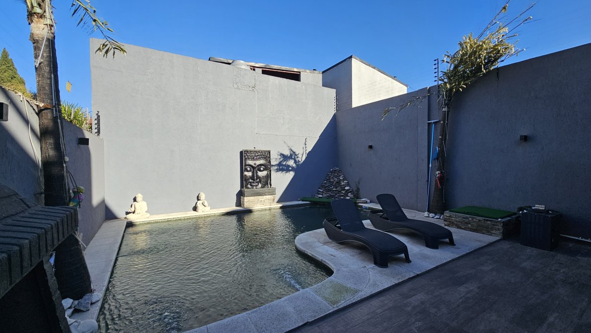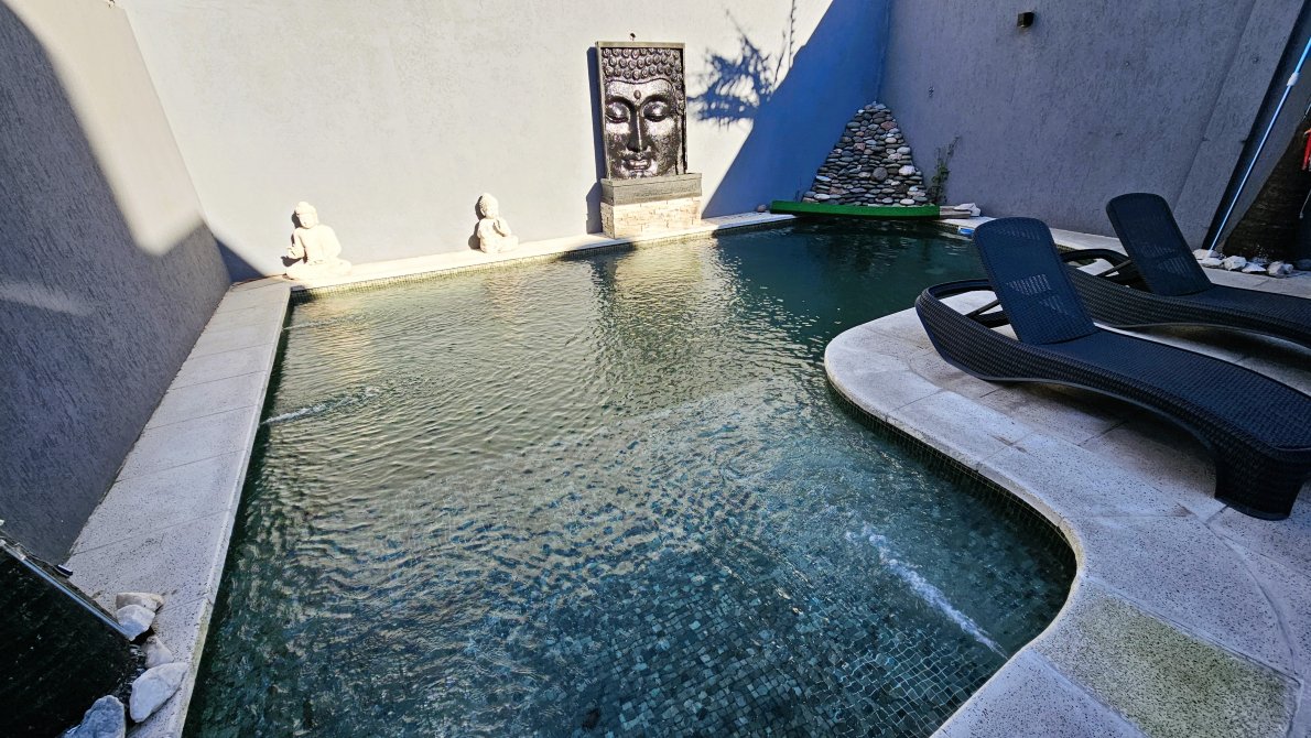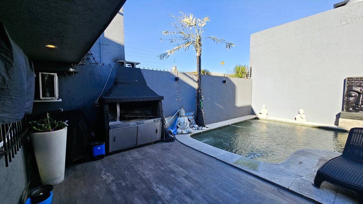Fondo de 8.66m x 9,60m con piscina climatizada, casacada y sector de solarium.