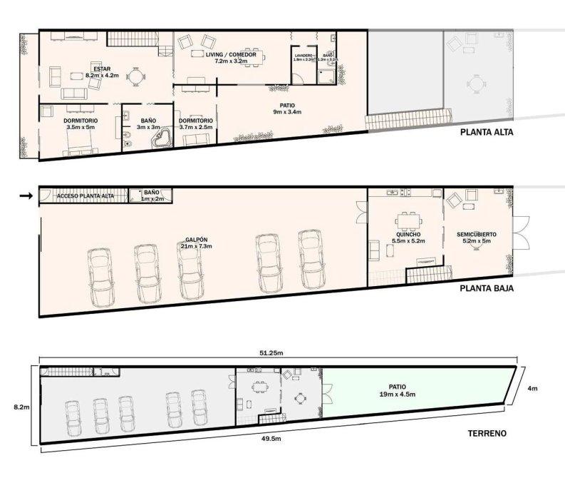 En la planta baja, un amplio deposito de 7.30x21 mts. A continuacion quincho con parrilla y fondo libre.