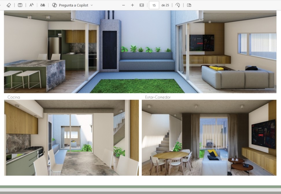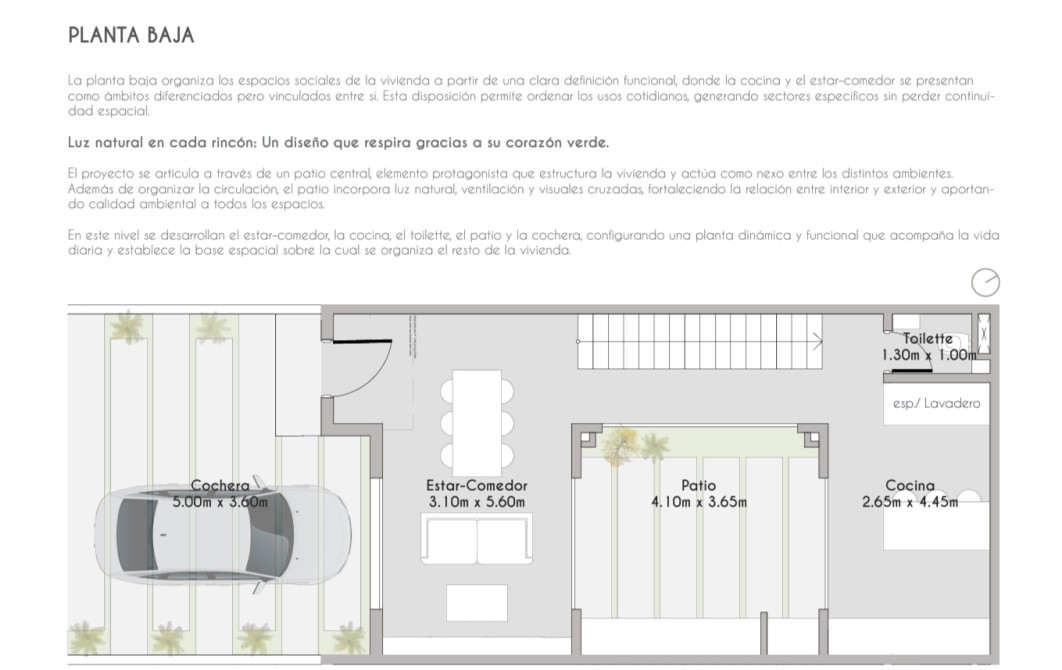 En este nivel se desarrollan el estar-comedor, la cocina, el toilette, el patio y la cochera, configurando una planta dinámica y funcional que acompaña la vida